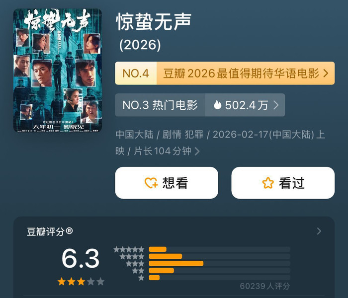 2月18日,让影迷多等了转眼的《惊蛰无声》也收到了我方的豆瓣收获单,不外,6.3分的开分进展让不少影迷暗意惟恐。