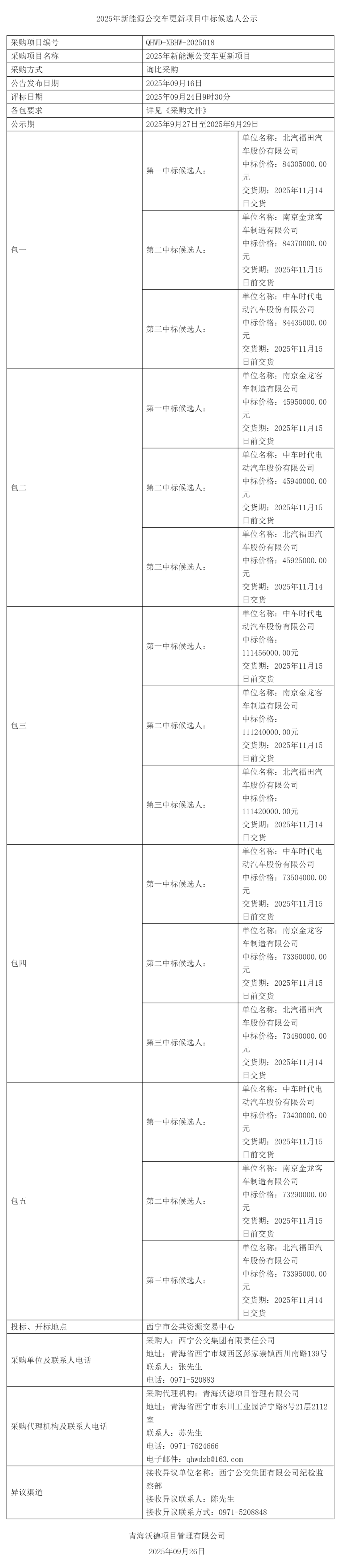 青海省西宁公错乱团2025年新动力公交车更新样子中标候选东说念主公示