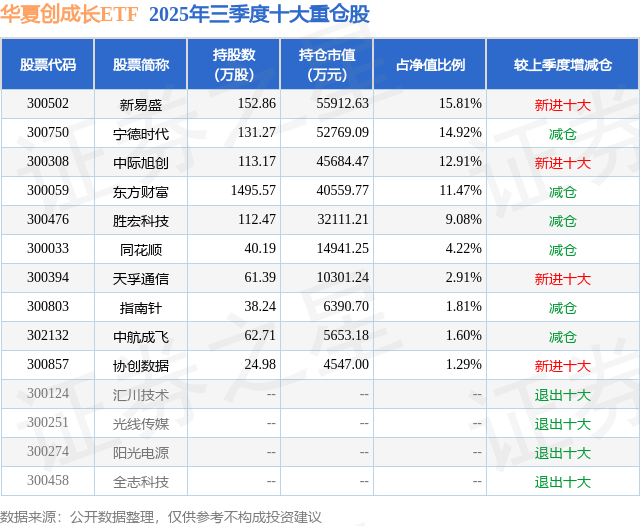从基金范围来看,中原创成长ETF基金2025年三季度公布的基金范围为35.38亿元,较上一期范围42.1亿元变化了-6.73亿元,环比变化了-15.98%。该基金最新一期金钱竖立为:股票占净值比99.42%,无债券类金钱,现款占净值比0.69%。从基金抓仓来看,该基金当季前十大股票仓位达76.02%,第一大重仓股为新易盛(300502),抓仓占比为15.81%。