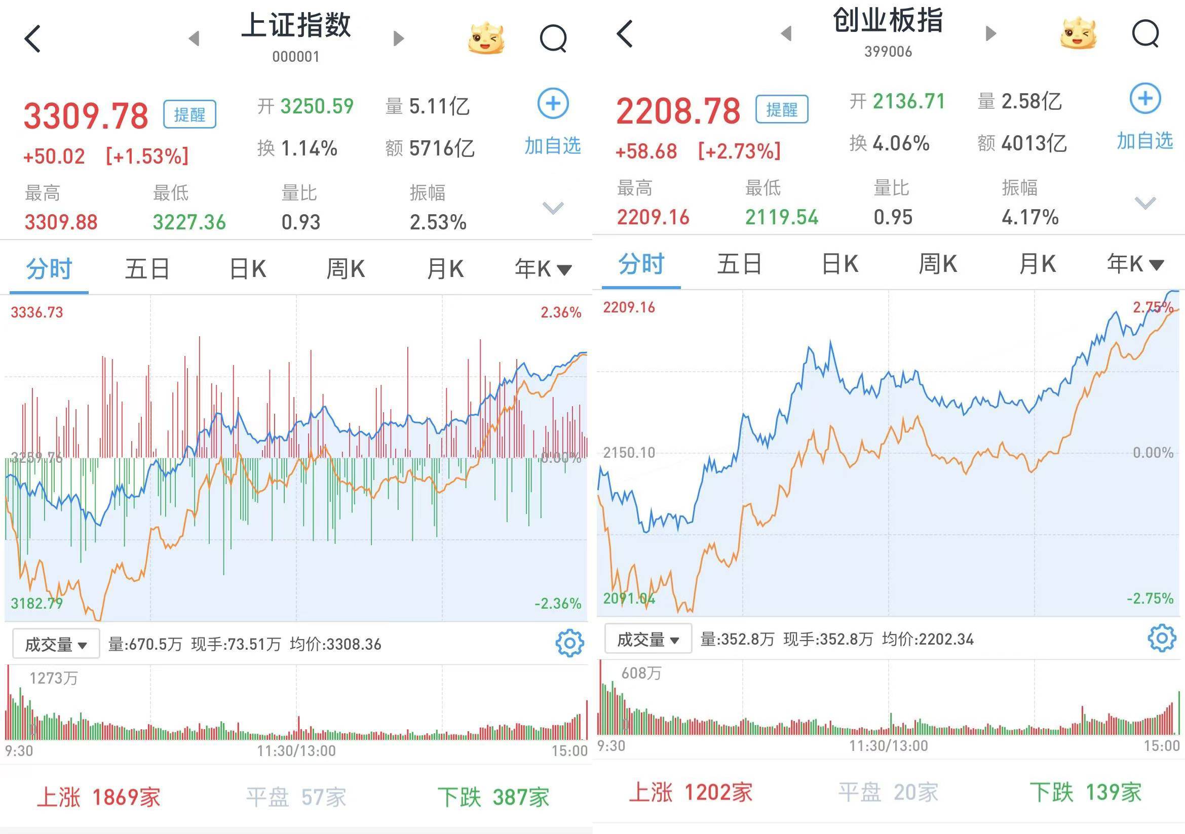 至收盘,上证综指涨1.53%,报3309.78点;科创50指数涨3.61%,报985.97点;深证成指涨2.25%,报10566.1点;创业板指涨2.73%,报2208.78点。