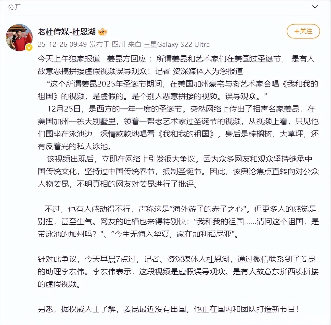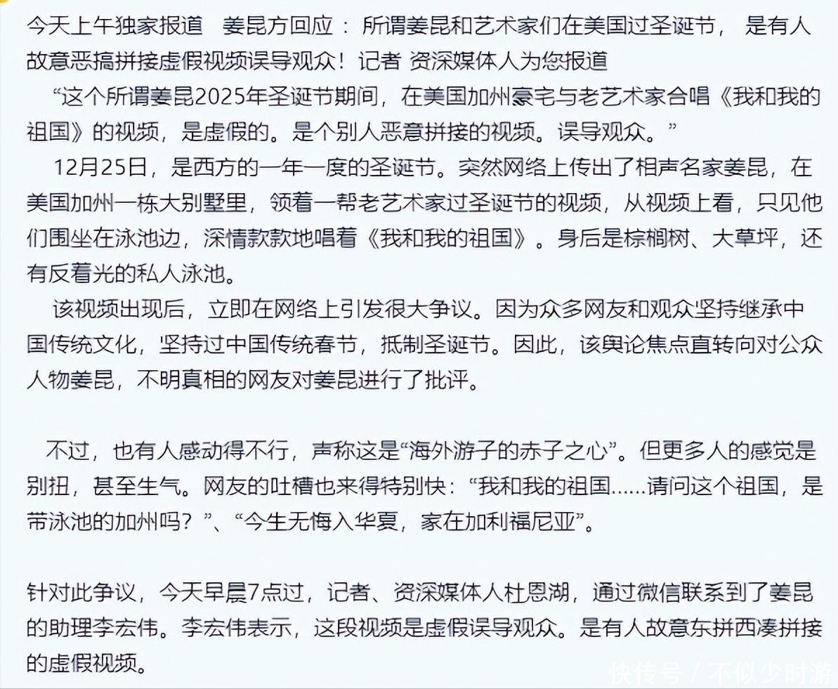 57. 有媒体记者通过应酬渠谈联系到姜昆助理李宏伟,后者明确回应:所谓“好意思国别墅庆圣诞”的视频系东谈主为裁剪拼接而成,熟识造作信息。