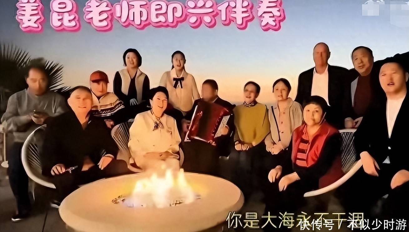 11. 视频画面骄横,姜昆踏进于一处作风西法的露天平台,四周遮蔽着节日灯饰,多位年长艺术家围坐一圈,中央燃起祥和篝火。