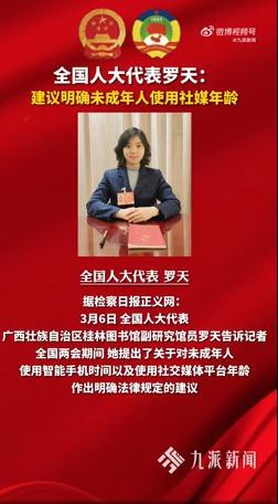 “数据披露,在数字化时期,中国网民限度达11.23亿东谈主,未成年网民超两亿东谈主。手机与应付媒体构建的‘凭空世界’,径直影响未成年东谈主的牵挂和念念辨武艺。”3月6日,天下东谈主大代表、广西壮族自治区桂林藏书楼副探讨馆员罗天告诉记者,天下两会技术,她建议了对于对未成年东谈主使用智高手机时刻以及使用应付媒体平台年齿作出明确法律规矩的建议。