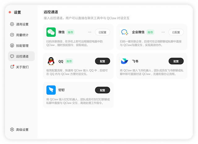 据先容,当前QClaw不仅复旧一键扫码接入微信和企业微信,还同步买通了QQ、飞书、钉钉等主流即时通讯器具。
