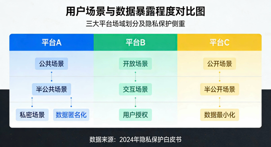 Tiktok为短视频算法推选,公域为主,更偏向生疏东谈主酬酢,弱关连强算法,隐秘保护不在个东谈主生物身份的显现,而是行动数据被多数收罗,侧面画像被精确分流投入不同流量池,是以个东谈主行动数据显现最高,处理要点放在算法透明度和谢绝过度收罗数据,如位置,剪贴板和声息[7]。