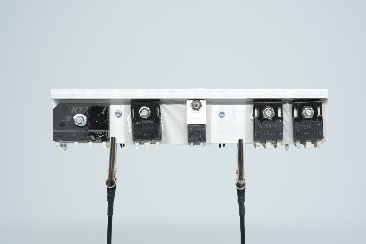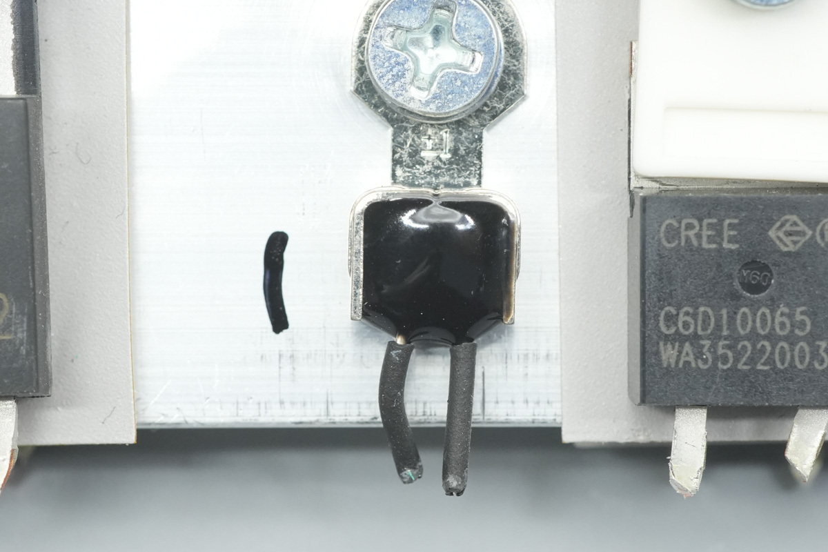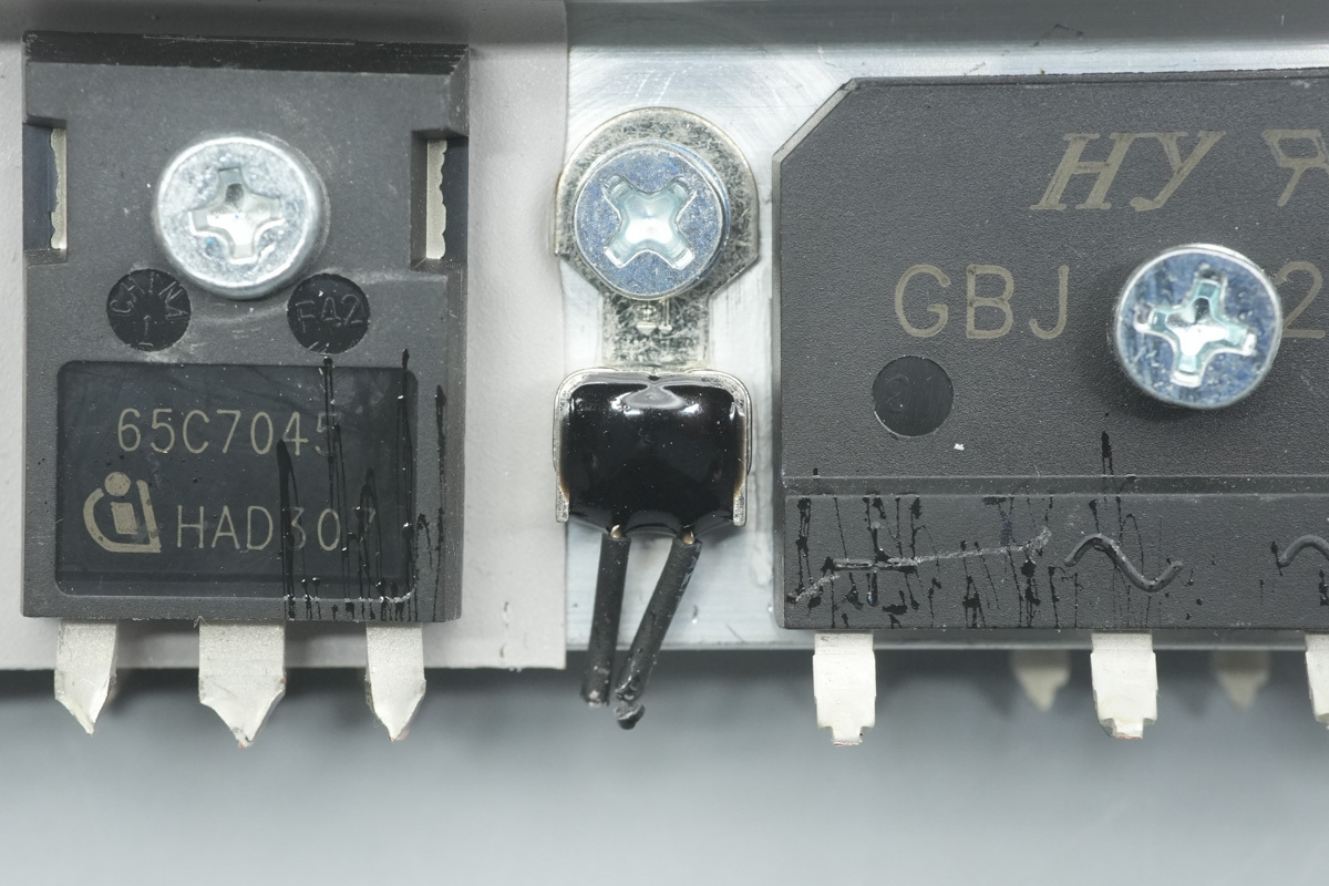 散热片一面设有LLC开关管,热敏电阻,PFC整流管,PFC开关管和整流桥。