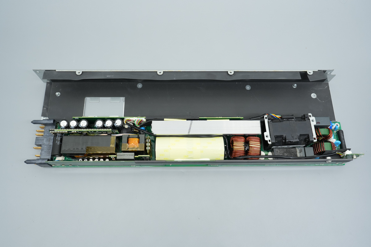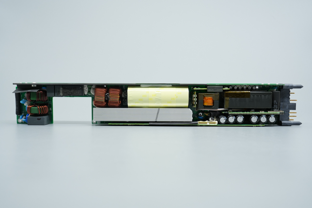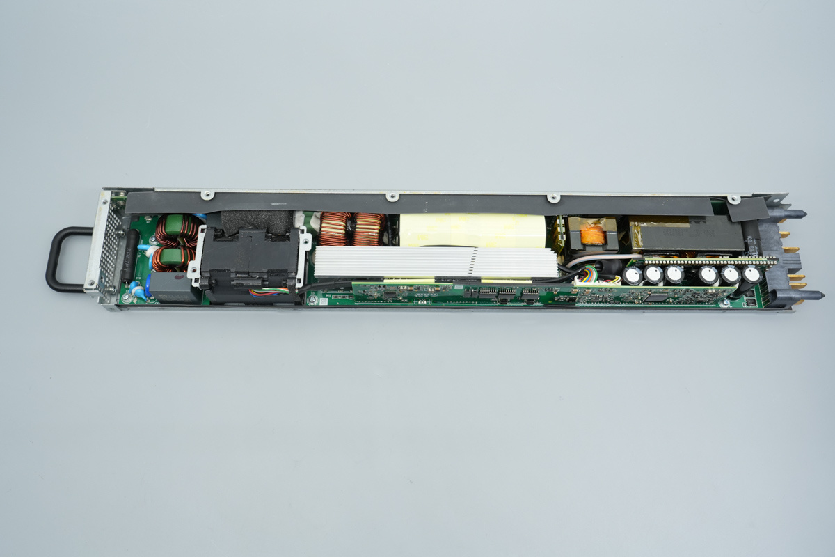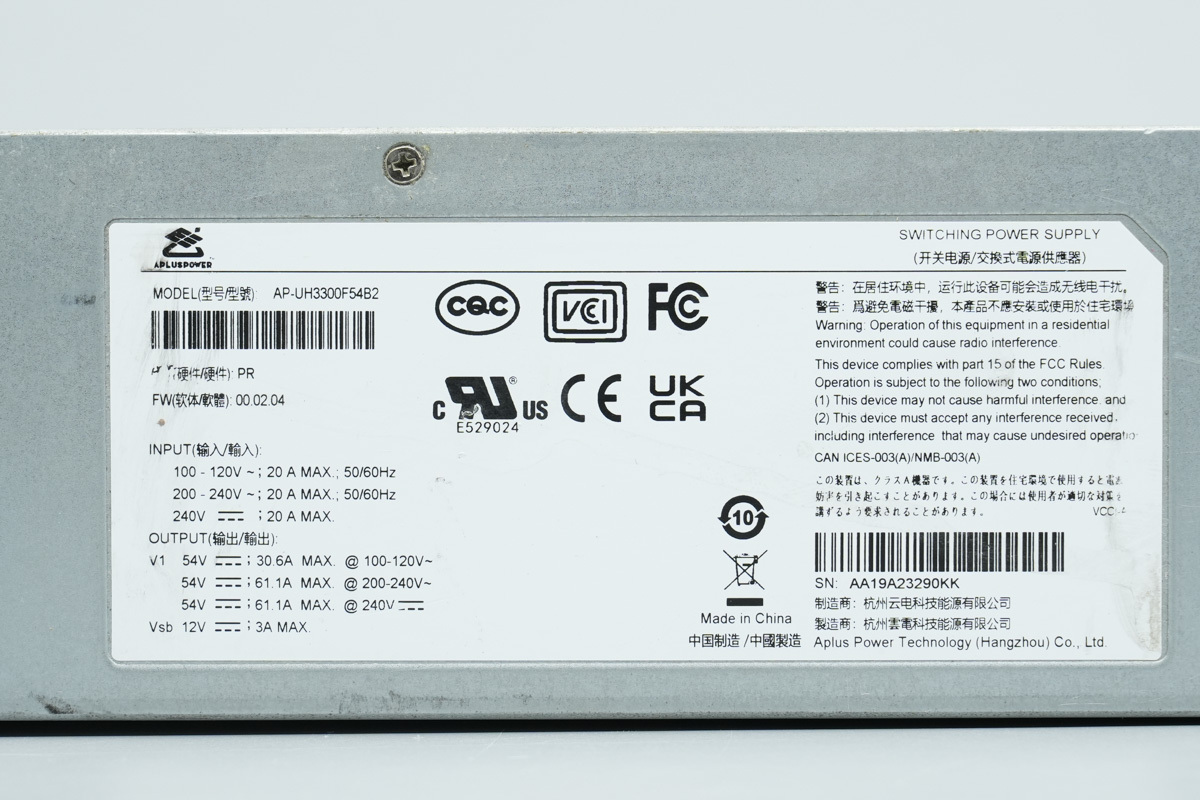 云电科技这款碳化硅工作器电源型号为AP-UH3300F54B2,撑捏100-240V交流输入和240V直流输入,主路输出电压为54V,输出电流61.1A,待机电源输出电压为12V,输出电流3A。电源尾部设有一时势结合器,面板里面设有散热电扇,吸入空气从尾部吹出散热。