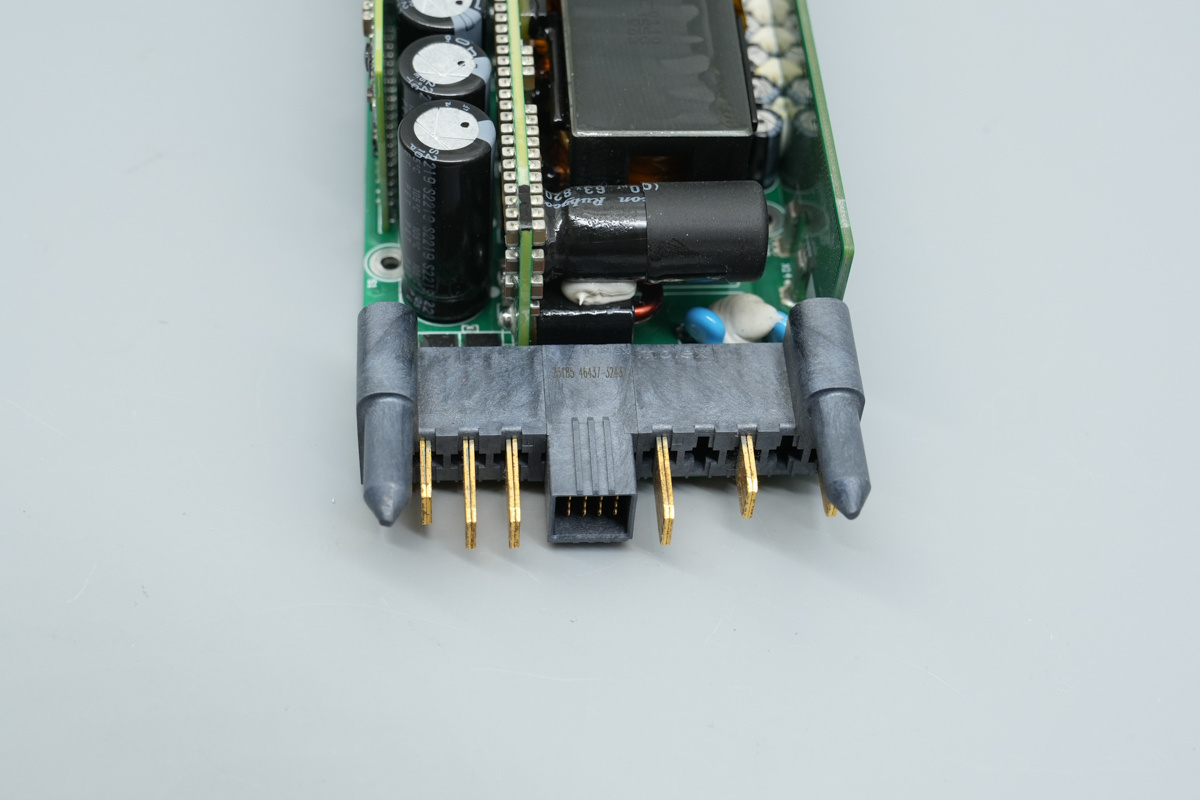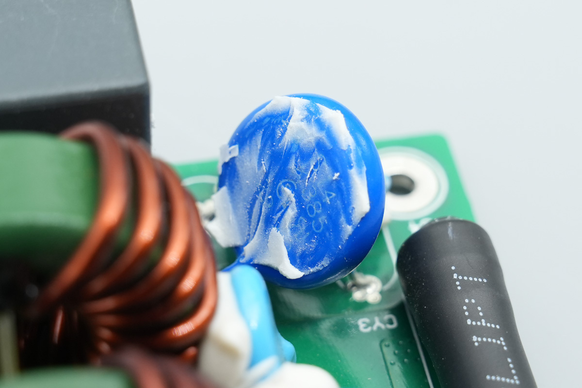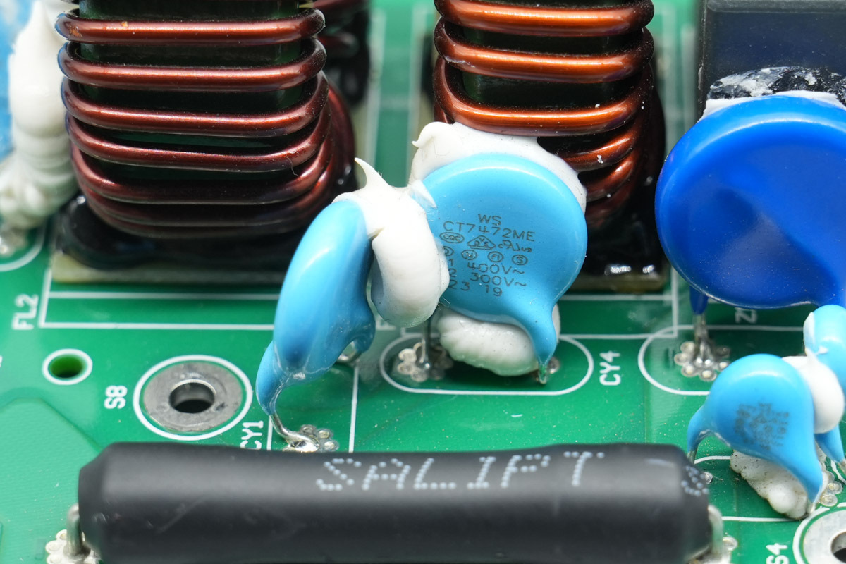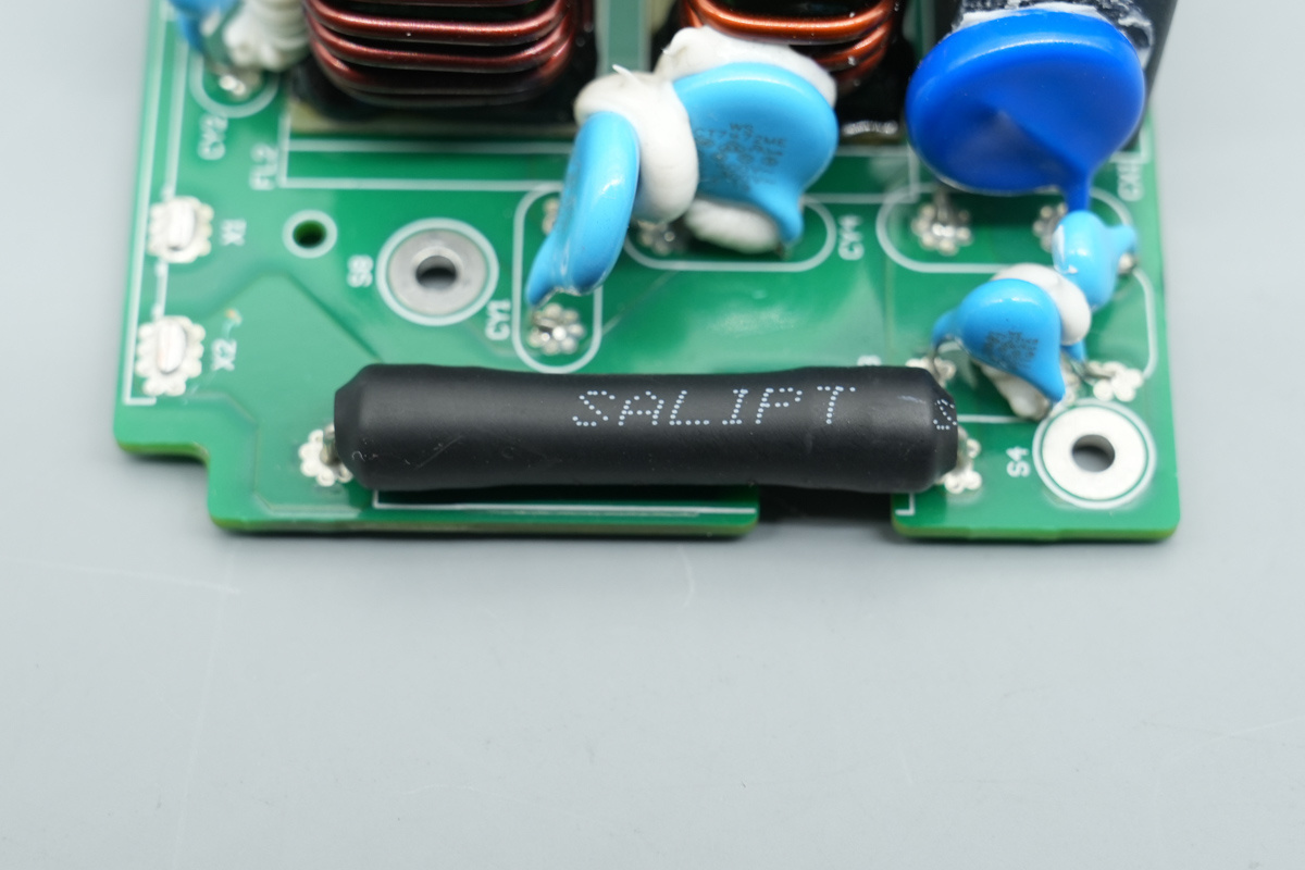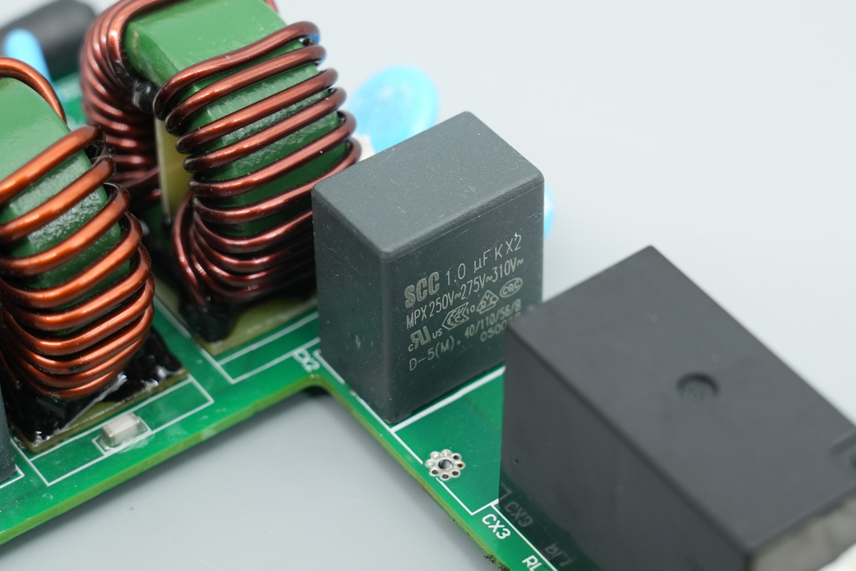 PCBA模块正面一览,顶部设有长条小板用于结合交流输入,左侧设有保障丝,安规X2电容,压敏电阻,共模电感。纪律设有继电器,NTC热敏电阻,PFC升压电感,高压滤波电容。