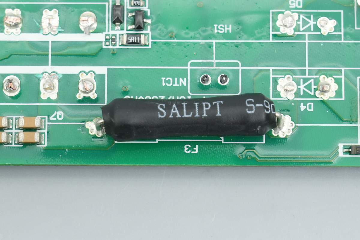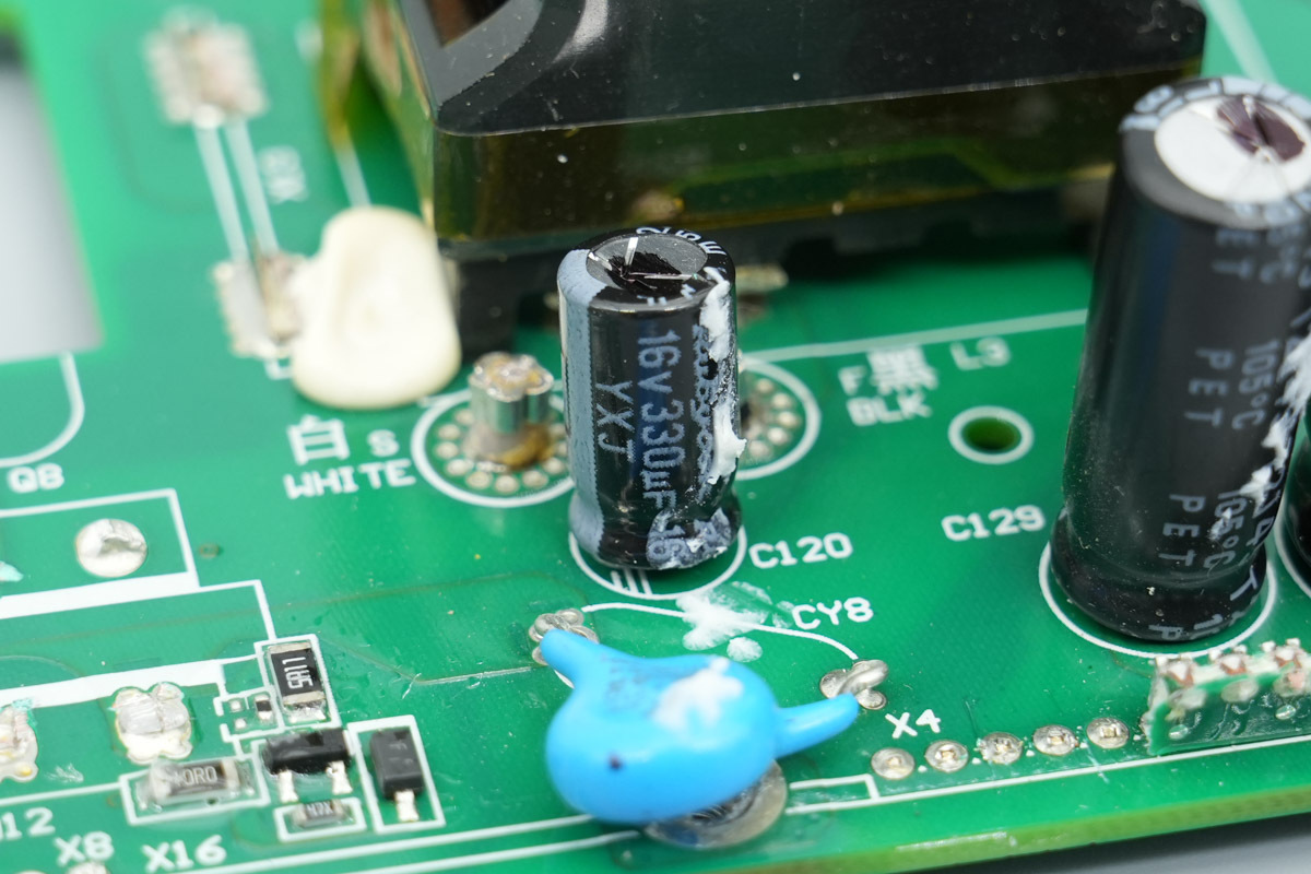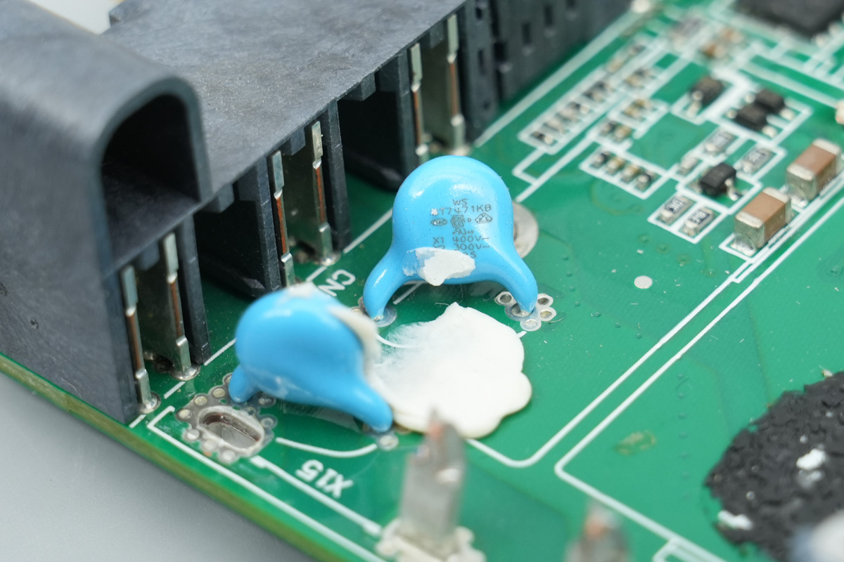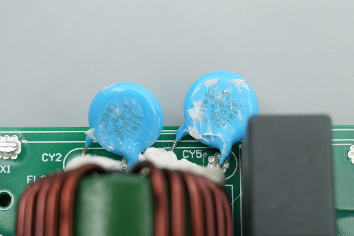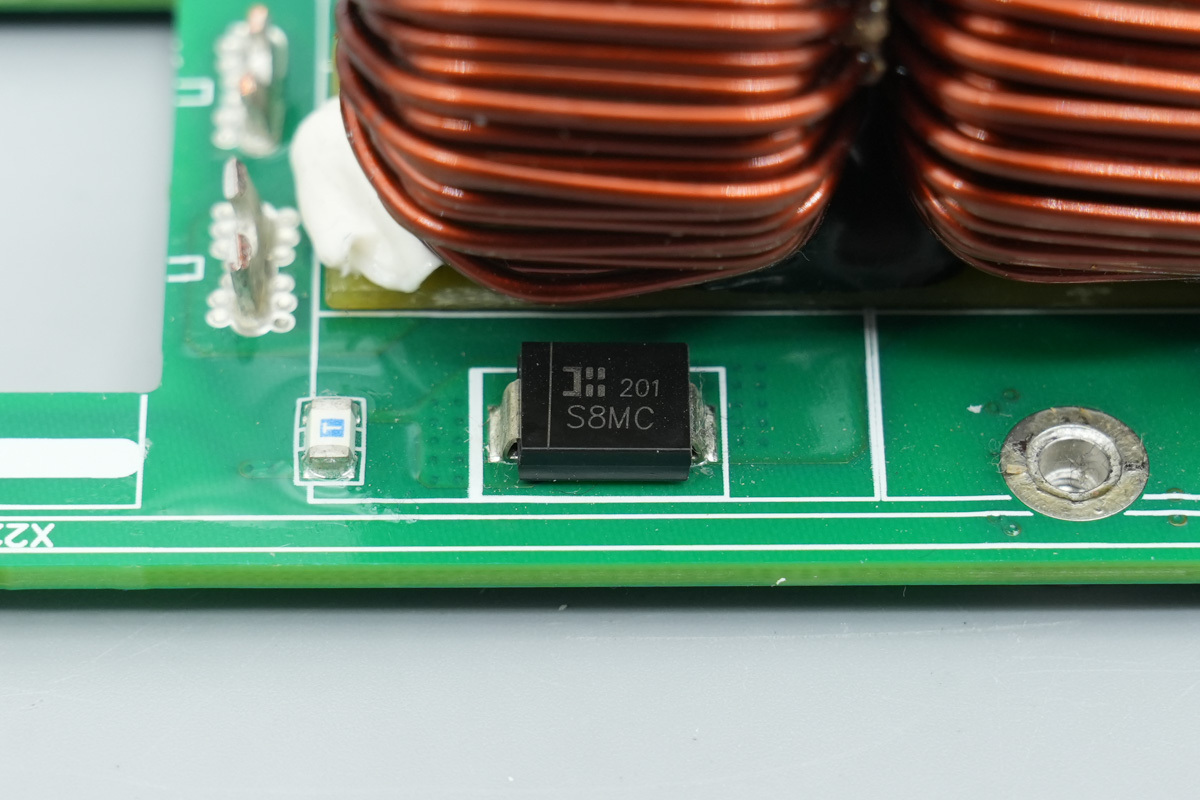 PCBA模块正面一览,顶部设有长条小板用于结合交流输入,左侧设有保障丝,安规X2电容,压敏电阻,共模电感。纪律设有继电器,NTC热敏电阻,PFC升压电感,高压滤波电容。