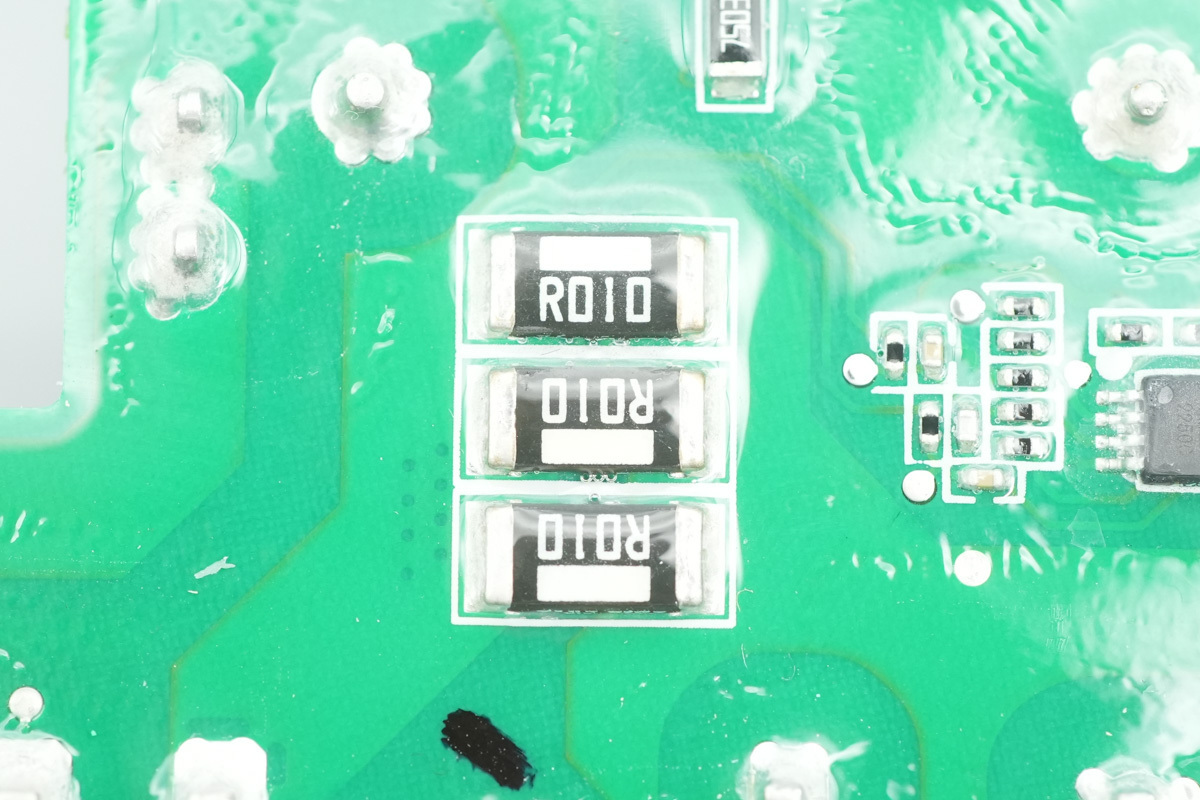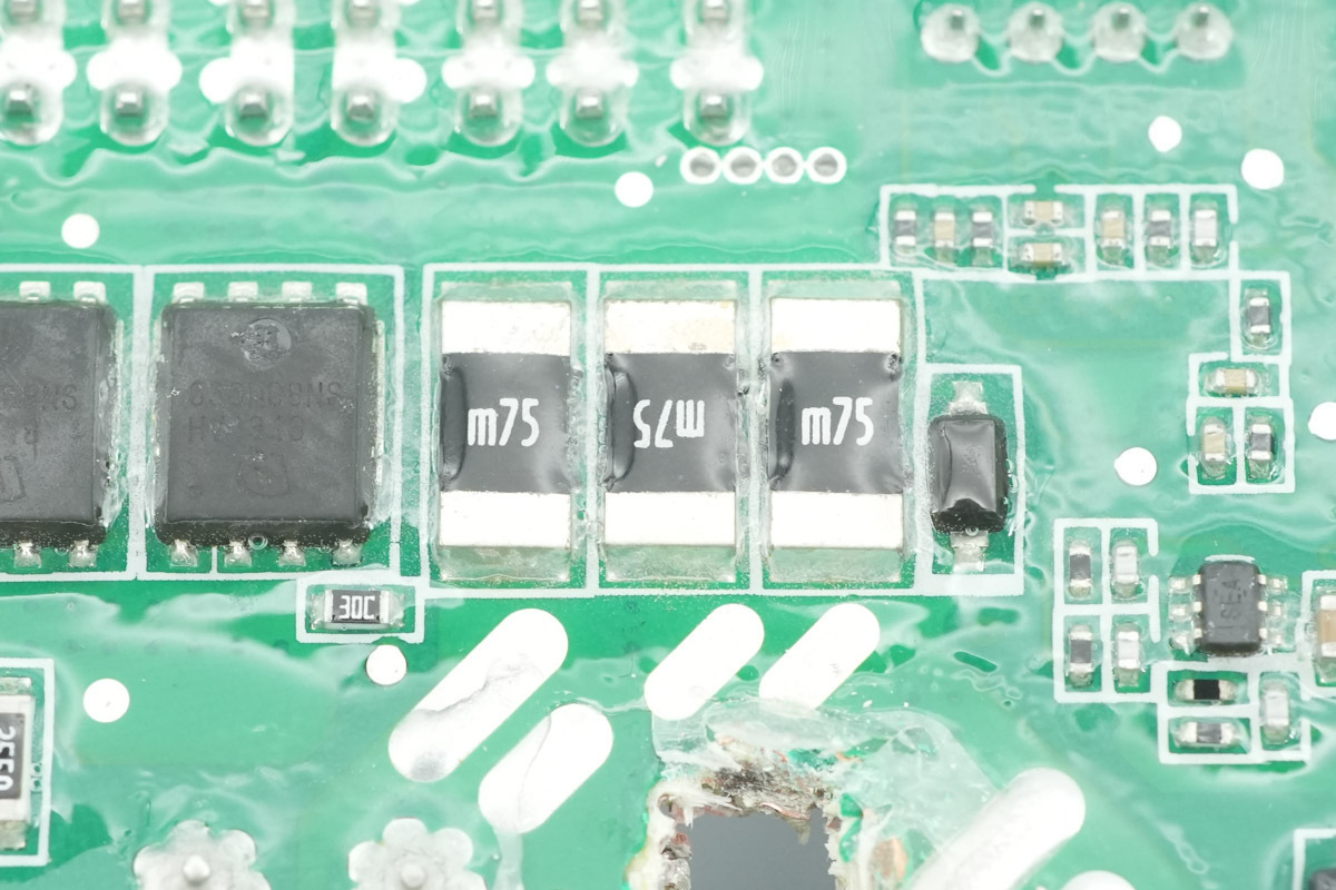 3颗0.75mΩ取样电阻并联,用于检测输出电流。