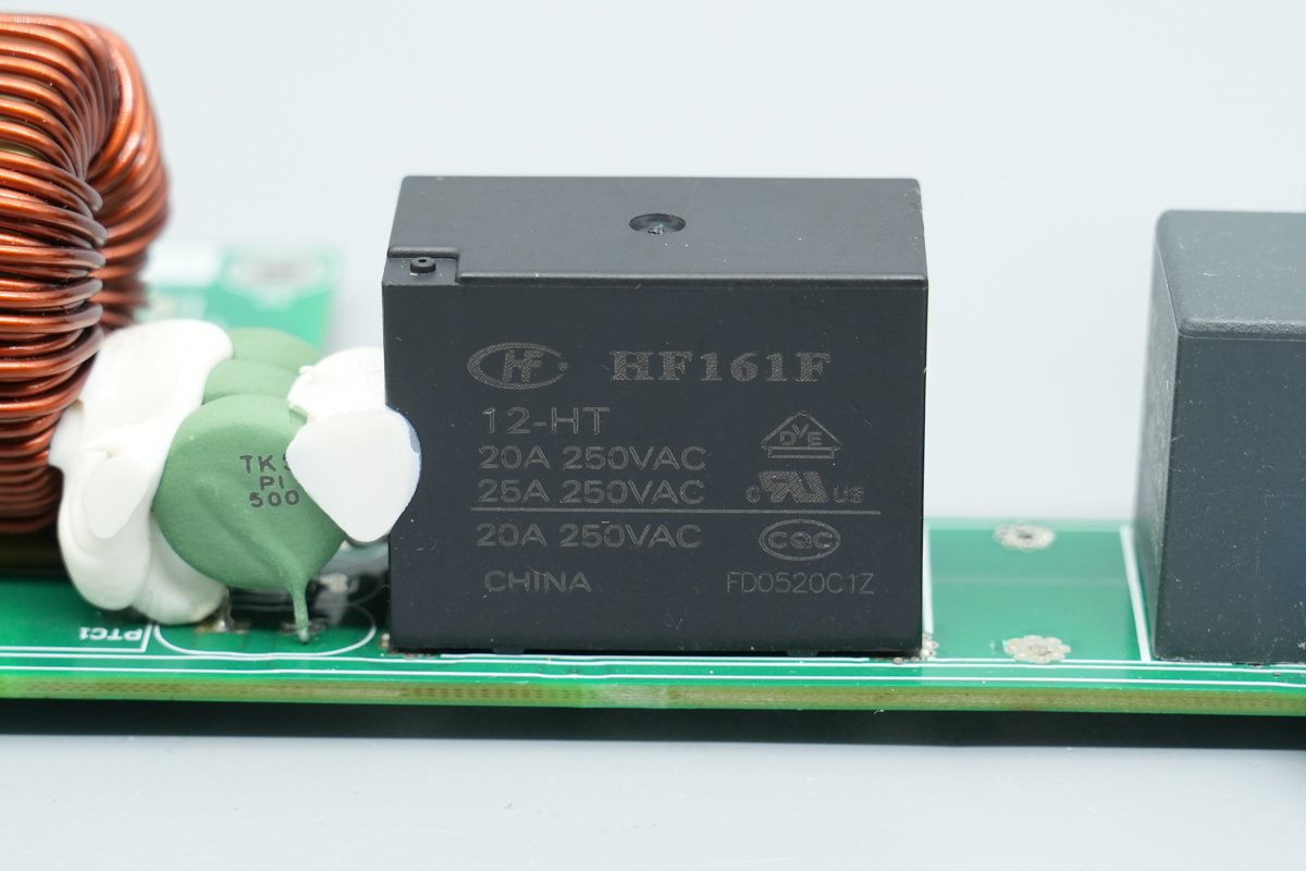 继电器来自宏发,型号HF161F/12-HT,为微型大功率继电器,内置一组常开触点,触点切换智力为25A,线圈电压12V。
