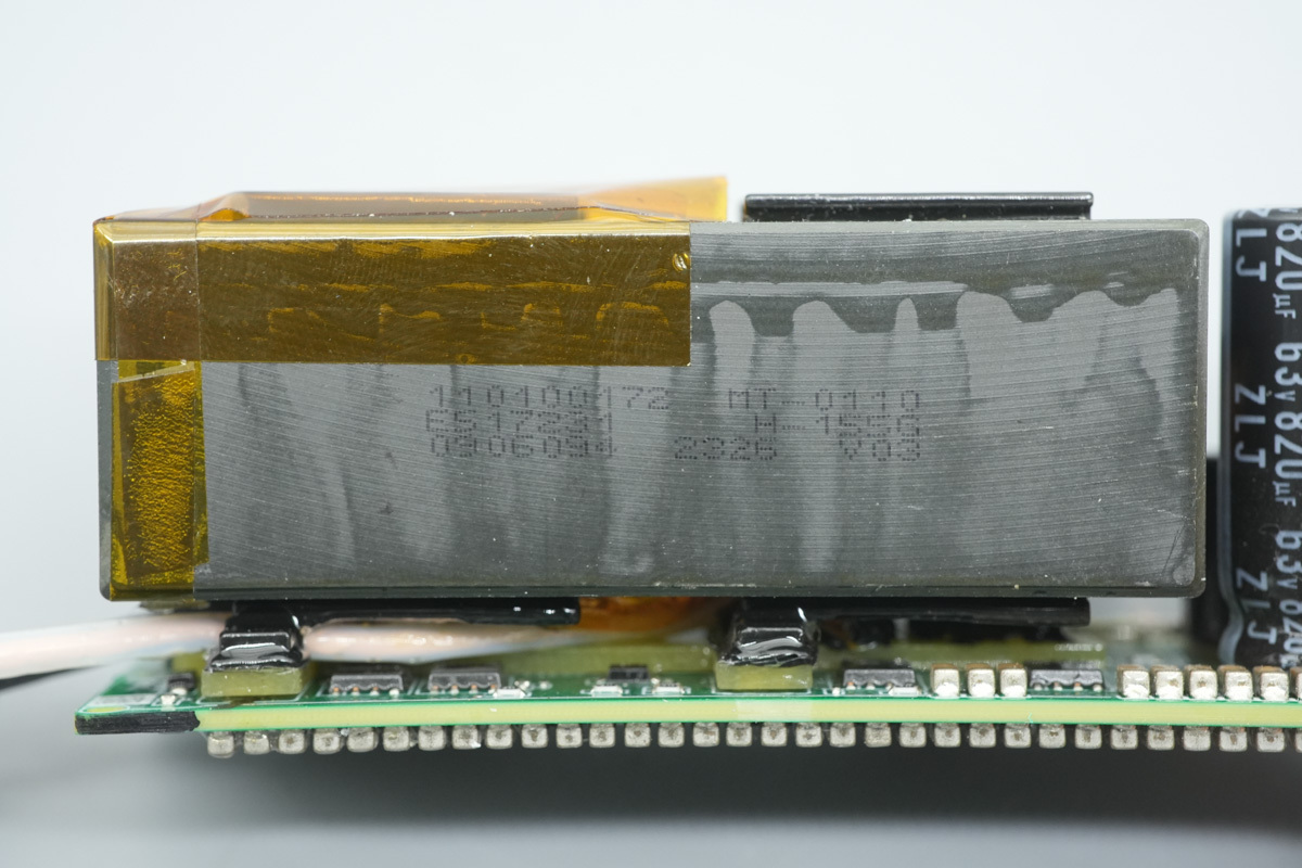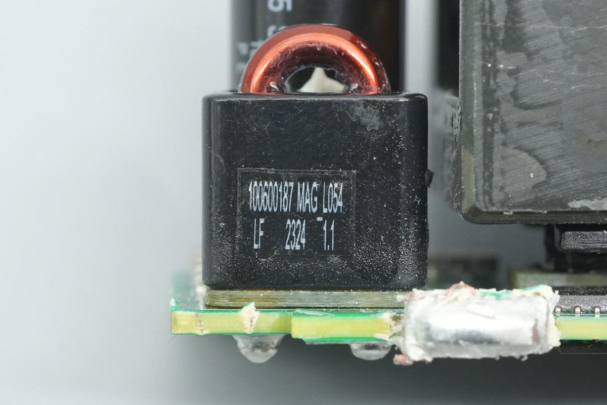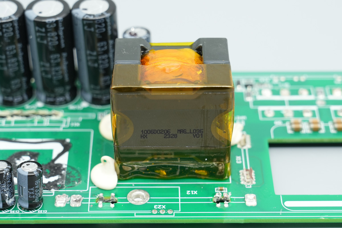 变压器磁芯为合座联想,下方设有电木板和同步整流管。
