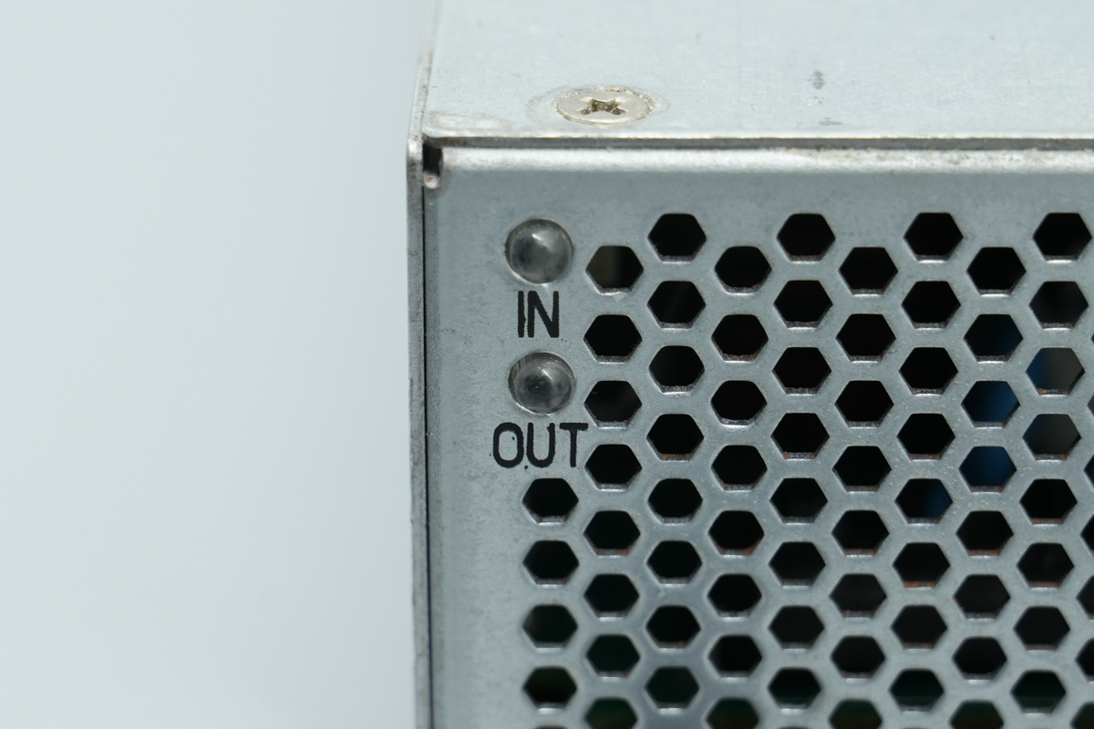 电源尾部设有散热格栅和结合器,其中结合器左侧为直流输出,右侧为电源输入,中间为通讯端子。