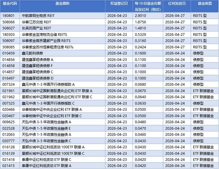 (1)04月23日新发基金共有4只,主要为夹杂型基金;基金分成44只,多为债券型,派发红利最多的基金是中航首钢生物资紧闭式基础花样证券投资基金,每10份基金份额派发红利2.9010元。